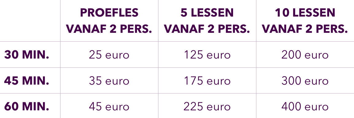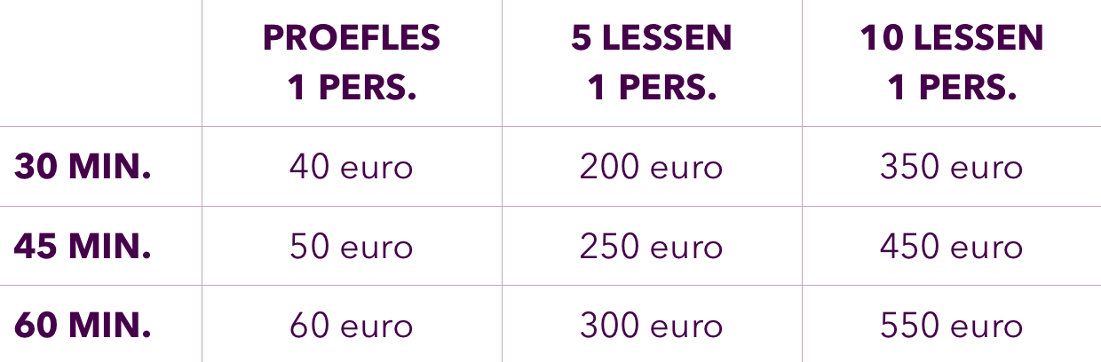 - Enkel gevorderden kunnen losse lessen (tarief proefles) boeken.